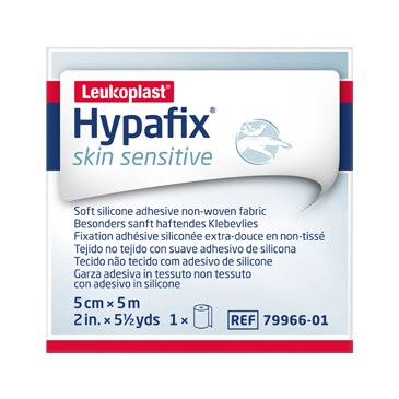 Características: Hypafix Skin Sensitive Rollo de Fijación de Tela no tejida en poliéster con adhesivo de silicona. Medida 5cm x 5mts